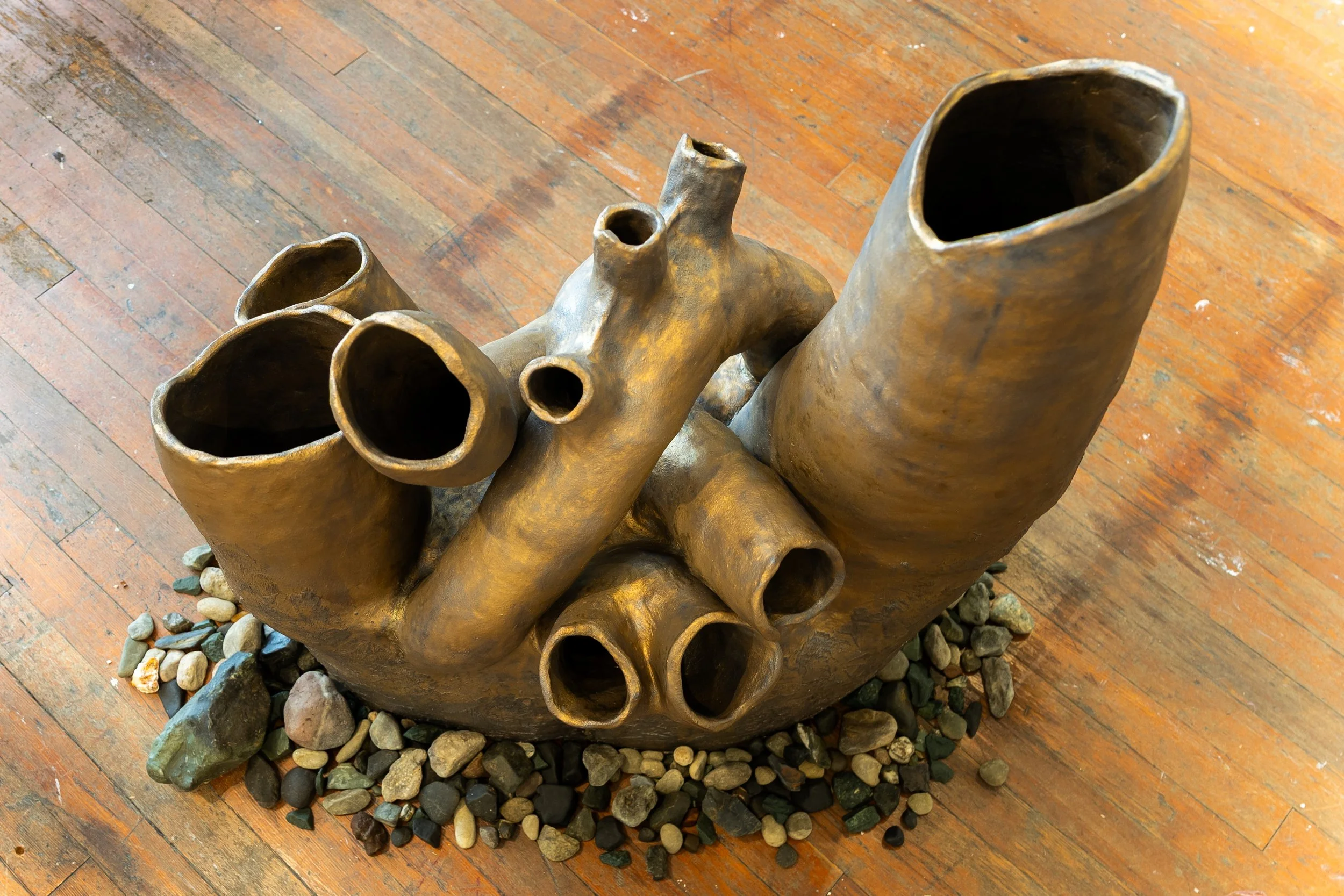 VENA CAVA, 2025 Ceramic, San Pablo Bay shore rock (primarily blueschist and serpentine) 34 x 46 x 27in Installation at Root Division for Introductions 2025 - photo by Hunter Ridenour